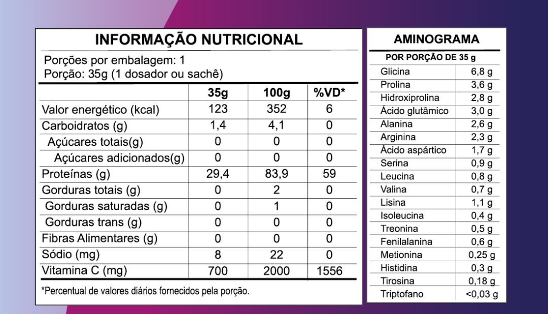 Colágeno hidrolisado, proteína hidrolisada da carne bovina, aromatizante, ácido cítrico, ácido ascórbico (vitamina C) e sucralose. Não contém glúten. Contém derivados de carne bovina.